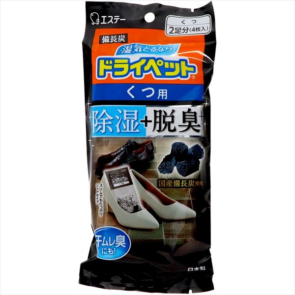 除湿剤に備長炭と活性炭を特殊配合しているので、湿気をとりながら、気になるニオイを脱臭します。湿気を吸うと薬剤がゼリー状になり、除湿効果がひとめでわかります。革靴・スニーカーなどの内側の湿気をとり、足ムレ臭などのイヤなニオイを脱臭します。