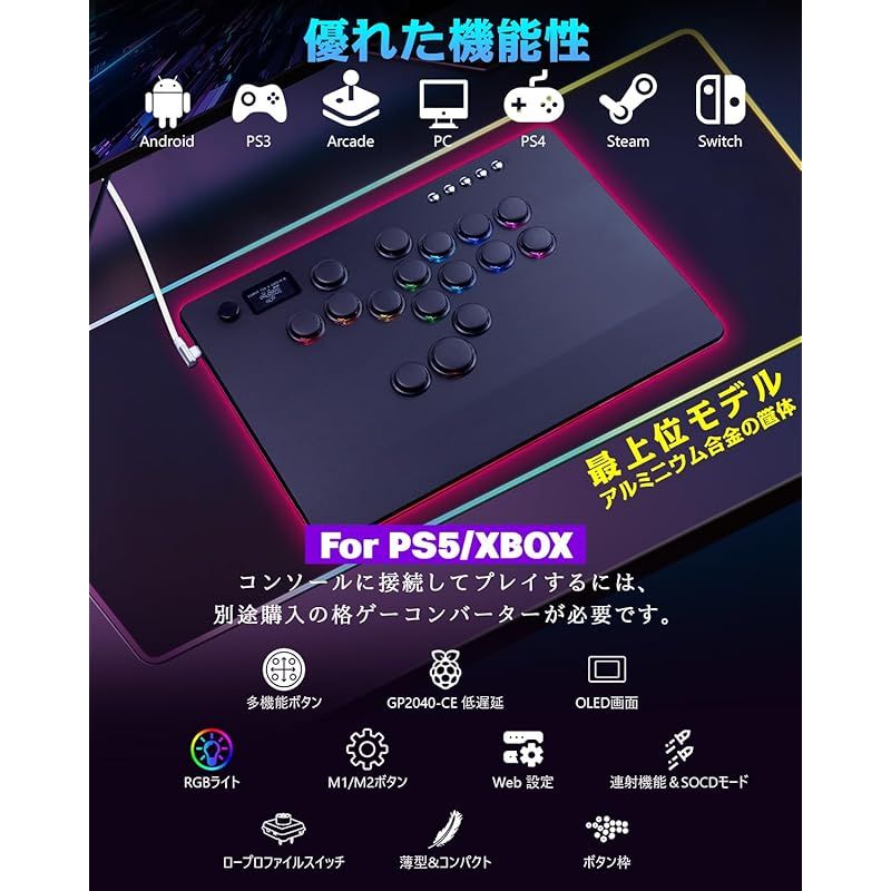 このレバーレスコントローラーは、格闘ゲームに最適化された高性能入力デバイスです。業界初の多機能メニューボタンを搭載し、入力モード、Dpadモード、SOCDモード、ターボスピード、プロフィール設定、RGB LED など、すべての機能をワンタッチで簡単に切り替え可能。 高級感あふれるアルミ合金製の筐体に加え、静音設計のボタンとRGBライトがゲームの没入感を高めます。ボタン入力は従来のレバー操作よりも正確かつ高速で、格闘ゲームに最適なレスポンスを実現。 対応プラットフォーム は、Windows、PC、Switch、Steam Deck、PS3、PS4、Arcade、Android など多岐にわたります。PS5やXBOXで使用する場合は、別途コンバーターが必要です。 さらに、液晶ディスプレイを搭載し、キースイッチのホットスワップにも対応。低遅延のRaspberry Pi Pico GP2040-CE基盤を採用し、入力遅延1ms以下の超高速レスポンスを実現しました。