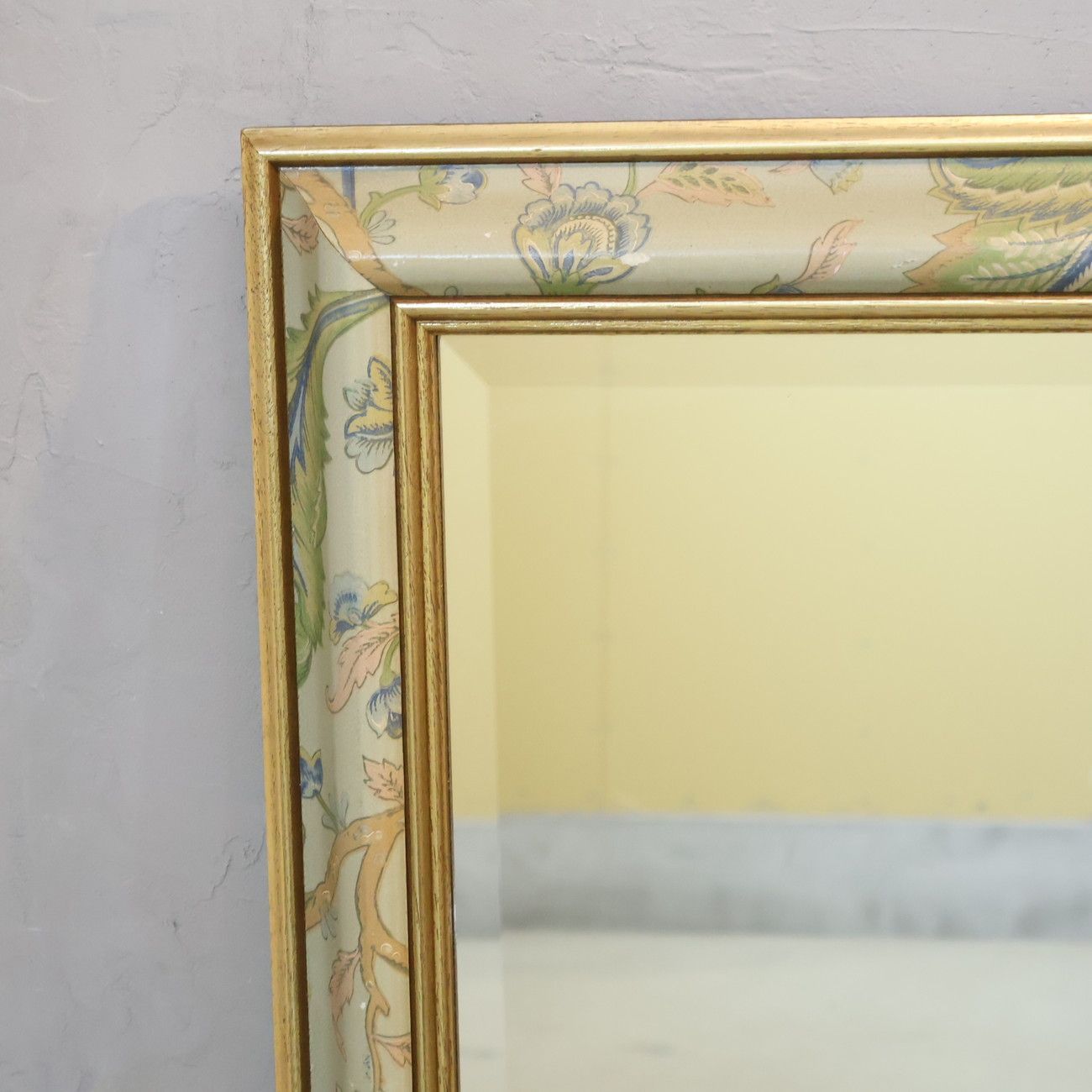 ゴールドの縁取りに淡い花柄の模様が施された上品で優雅な壁掛け鏡。