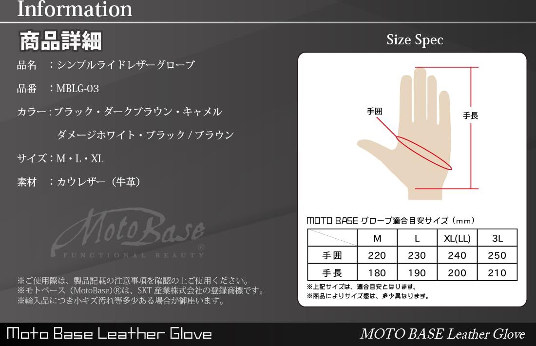 特徴:バイク用グローブとしての基本性能をシンプルにまとめたベーシックなレザーグローブです。 ・しなやかかつ丈夫な牛革を使用。 ・飽きの来ないシンプルデザインで幅広いスタイルに対応。 ・春・秋シーズンでの使用に適した定番レザーグローブ ・ライディング時グリップ等での摩擦で摩耗しやすい箇所は、生地を重ね補強。 ・人差し指と親指の先端は、タッチパネル対応生地使用