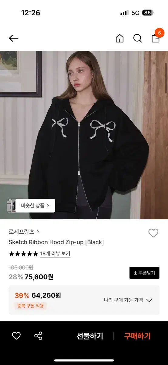 ローズ フランツ リボン ジップアップパーカー フード付き 黒