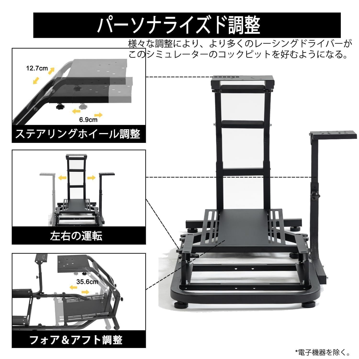 【自由に調整可能】G29コックピットの高さと長さは調整可能。ハンドルプラットフォームは伸縮調整可能。シフトレバーの取り付けは左右に変更可能。様々な調整機能により、より多くのレーサーにこのシムコックピットを気に入っていただけます