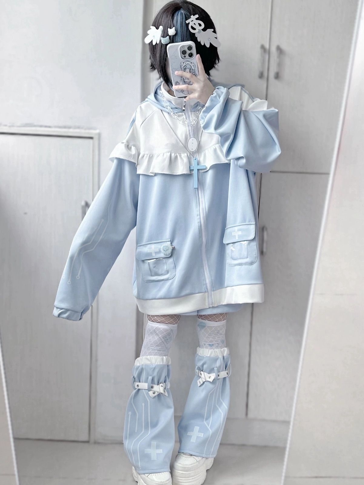 セットアップ サブカル 天使界隈 パステルブルー 量産型 サイバー y 2 k リボン 地雷系 原宿 渋谷 推し活 病みかわ かわいい 水色界隈 パーカー トップス ジャージ ゆったり ガーリー系 アウター バイオエンジェル ロリータ フード付き 耳付き