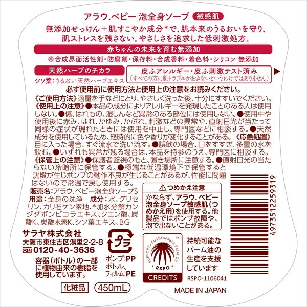 -12点セット アラウベビー泡全身ソープ 敏感肌 450mL サラヤ ベビー用品