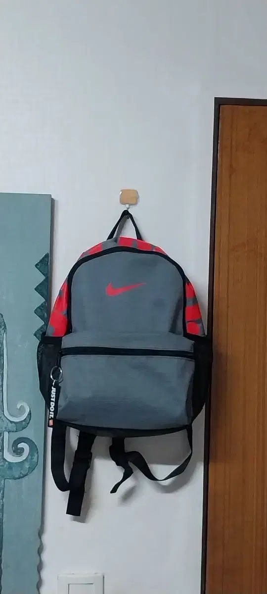 バッグの側面には、水のボトルを入れることができるメッシュポケットがあります。バッグに「JUST DO IT.」と書いてあるポイントキーリング付き