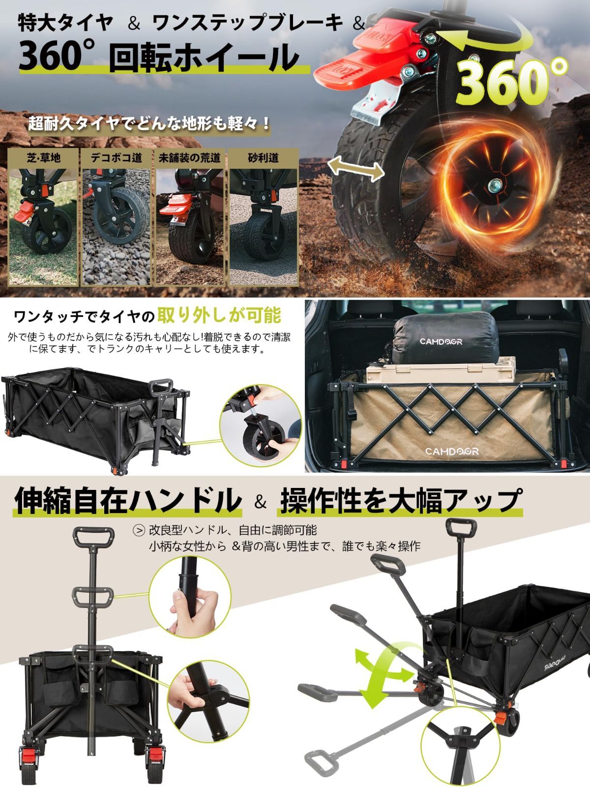 【全地形対応タイヤ+ワンプッシュブレーキ】特大タイヤ、360°回転ホイールを備えたキャリーカート 4輪モデル。幅広タイヤで、砂利道・悪路・坂道でも安定走行。ワンプッシュブレーキ搭載で、15度の傾斜でも安全に停止。大型タイヤは取り外し可能で、車内清掃も楽々。キャンプ キャリーワゴンとしても高性能を発揮します。