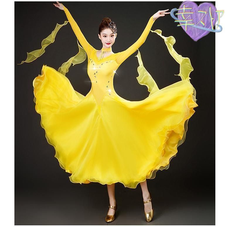 社交ダンスドレス 社交ダンス モダンドレス イエロー 大きいサイズ 長袖 大きい裾 ドレス ワルツダンス ワンピースドレス ダンWP