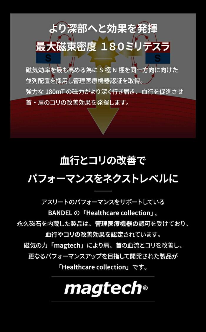 サイズに応じて95粒または115粒のビーズが連なる煌びやかなジュエリーのような見た目でありながら、最大磁束密度180mTの強力な磁力が首・肩のこりの緩和と血行の促進に作用する管理医療機器認証を取得した永久磁石磁気治療器です。