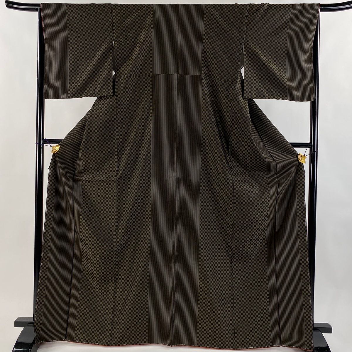 お召 身丈168 cm 裄丈65 M 袷 縦縞 市松 焦茶色 正絹
