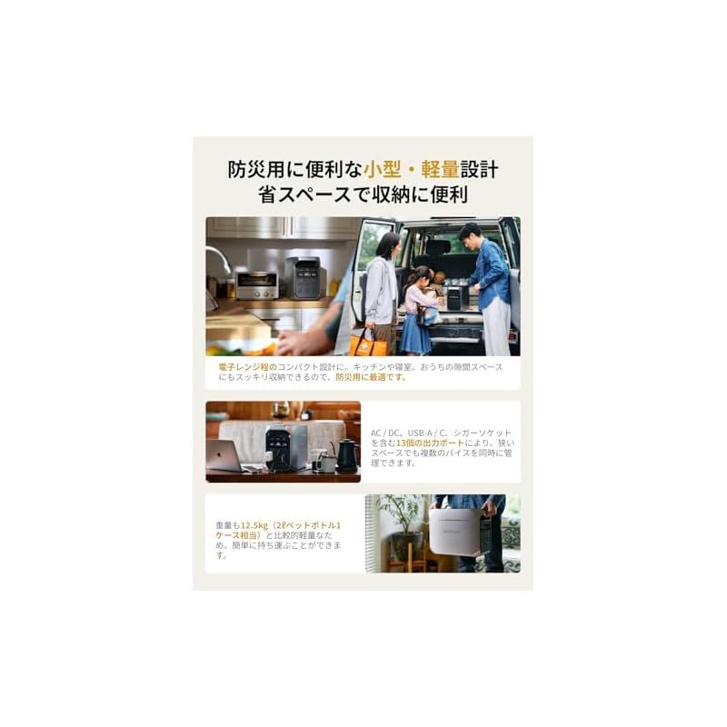 「防災用に便利な小型 & 軽量設計」キッチンや寝室、車のトランクや助手席に簡単に収まる省スペース設計です。防災用で自宅に置いても邪魔にならず、重量も2?ペットボトル1ケース相当と持ち運びに便利、もしもの備えやアウトドアシーンに最適です。また、コンパクトデザインを誇るDELTA 3 Plusポータブル電源は13個の多用途出力ポートを有し、多くの電化製品をサポートします。多様な入力ポートも装備し、複数のデバイスに同時に対応します。