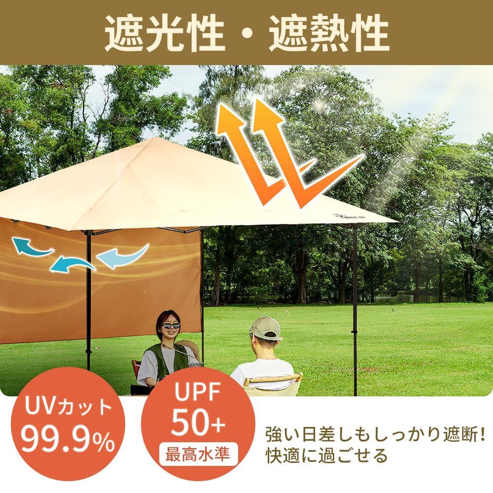 【生地仕様】ポリエステルオックスで作られた天幕の耐水圧は800mm以上あるだけでなく、縫い目からの雨漏れを防ぐシーム加工が施されています。日よけ効果の高いUPF・UV加工に加え、遮光性・遮熱性に優れた内側PUコーティングを採用した為、雨の日でも酷暑でも活用できます。※写真の光の加減や角度により実物の色が多少異なる場合があります。