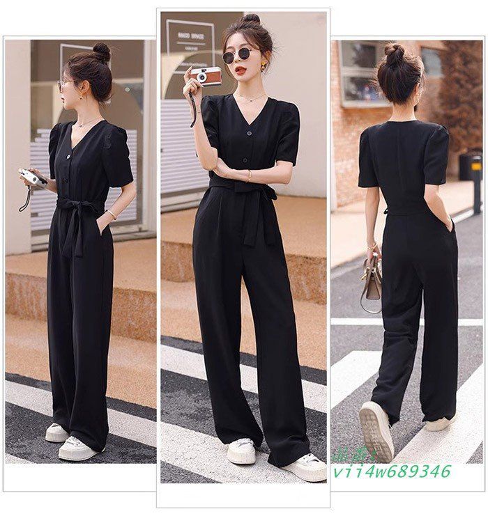 ジャンプスーツ オールインワン バックジッパー Vネック 半袖 ロングパンツ デート ワインレッド オフィス 旅行 ブラック ハイウェスト 普段使い カジュアル