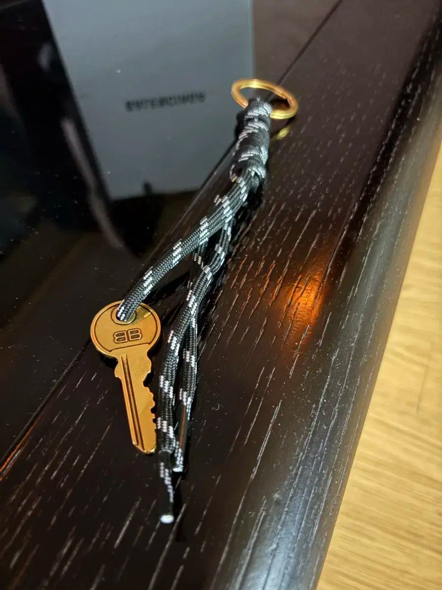 銅メッキカラー バレンシアガ キーホルダー 限定モデルです。黒い紐に付いている鍵モチーフのキーホルダーが高級感あります。希少な限定モデルなのでコレクション価値があります。