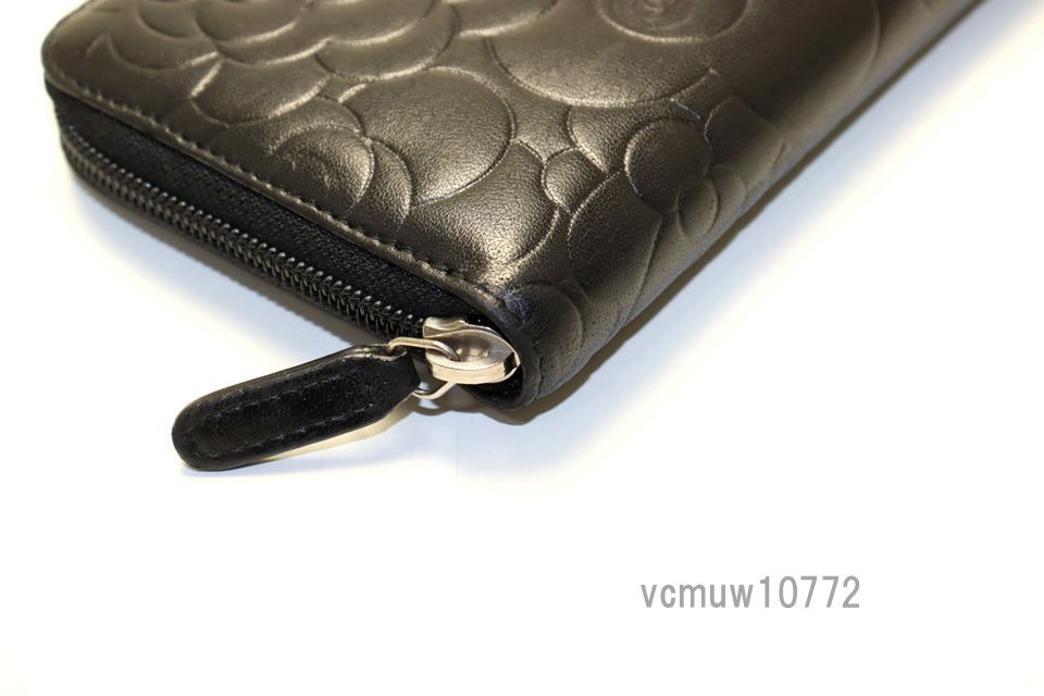 美 CHANEL 13番台 カメリア SV金具 レザー ラウンドファスナー 長財布 シャネル 1023 mr 29898