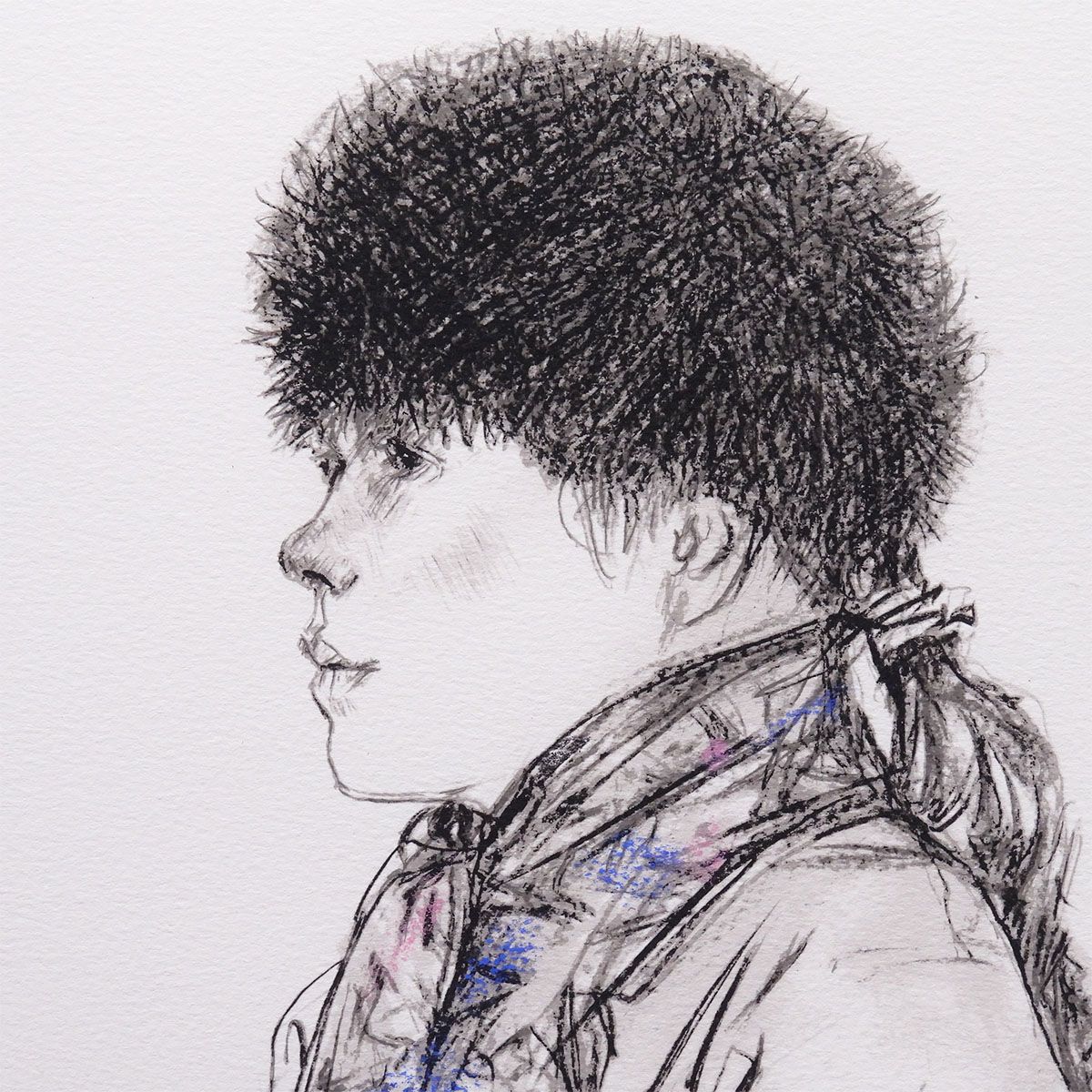 描かれる女性は、冬の静寂をまといながらも、芯に強さと温もりを秘めている。帽子やマフラーの重なりを通して感じられる量感、そしてマフラーに差された色彩が、冷たい空気の中の“生の体温”を浮かび上がらせる。