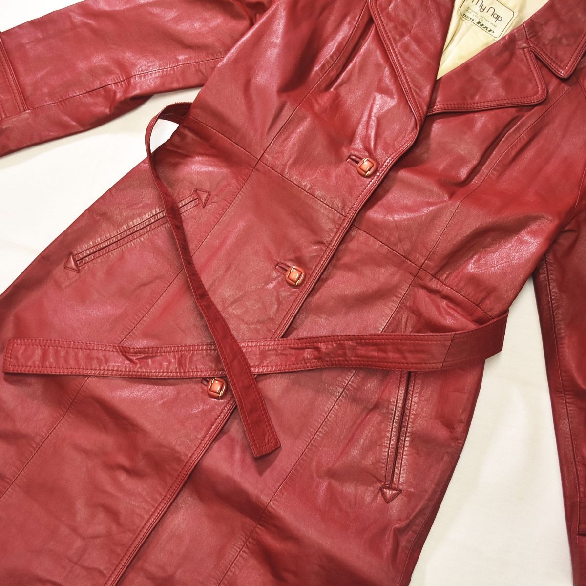 80 s 90 sヴィンテージ my nap 裏地ラクダ柄 Aライン レザー ロングコート アウター ジャケット レトロ古着 9 ワインレッド レディース