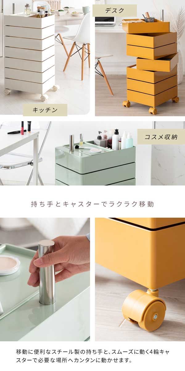 4輪キャスターでラクラク移動できます。棚はそれぞれ360度回転式で取り出しやすく、リビングや寝室、デスクなど色々なシーンでマルチにお使いいただけます。ベビー用品の収納にもオススメ。